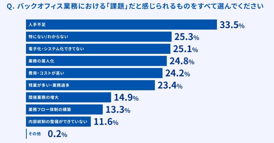 スタートアップやベンチャー企業におけるバックオフィス業務には、多くの課題があります。2024年にマネーフォワード社が公開した「バックオフィスのシステム導入に関する意識調査」によると、「人手不足」(33.5%)が最も多く挙げられ、次いで「電子化・システム化できていない」(25.1%)、「業務の属人化」(24.8%)、「コストが高い」(24.2%)、「残業や業務過多」(23.4%)となっています。